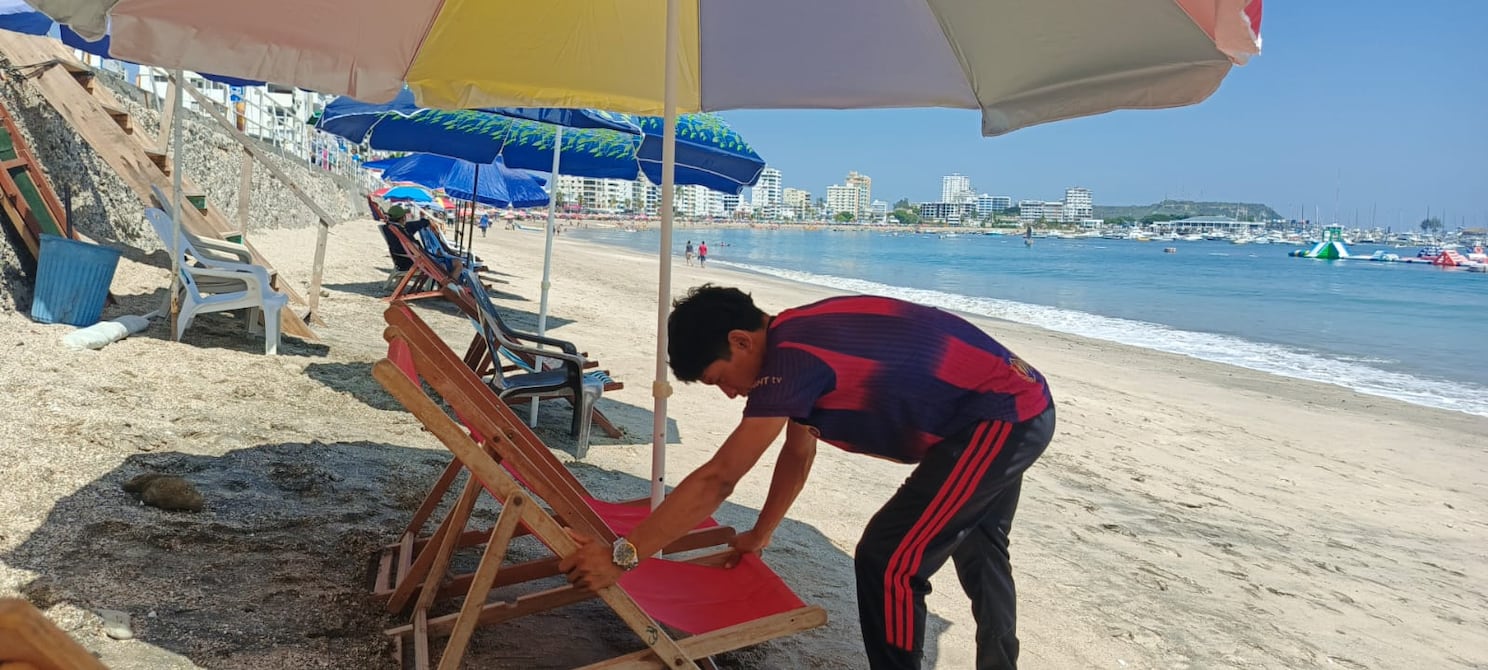 Abraham Balón, comerciante de la Asociación Playa, Mar y Sol, madrugó hoy para poner sus parasoles en la playa de Salinas.