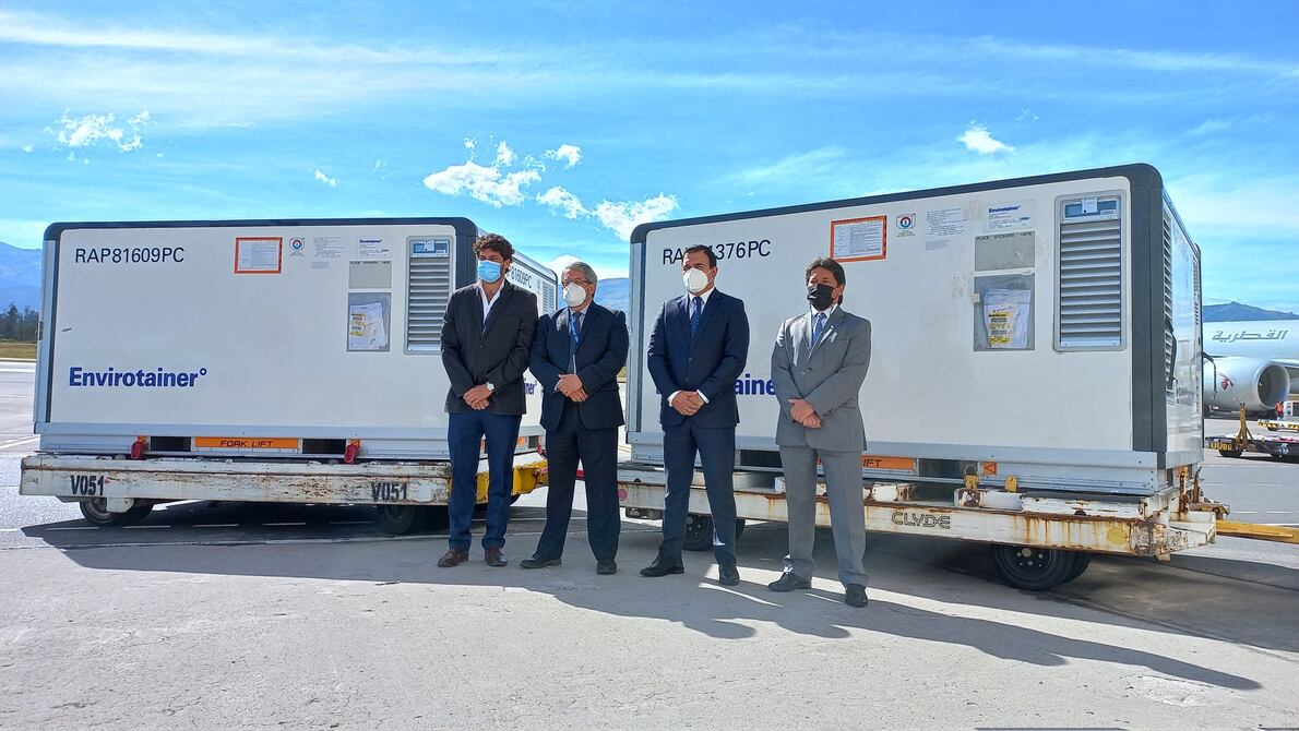 Al aeropuerto Mariscal Sucre, de Quito, arribó esta mañana el primer cargamento de vacunas contra el COVID-19 del laboratorio chino CanSino. En total llegaron 200.000 dosis.