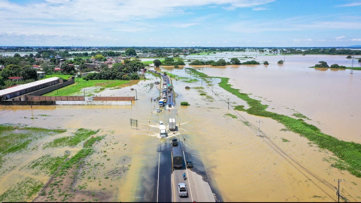 Este jueves, las intensas lluvias y el desbordamiento de los ríos han obligado a las autoridades a suspender totalmente el tránsito en la carretera E-25, específicamente en el tramo que conecta Babahoyo con la parroquia San Juan y la localidad de Jujan.