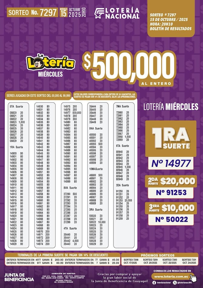 Estos son los resultados del sorteo 7297 de la Lotería Nacional, que jugó la noche del 15 de octubre de 2025.