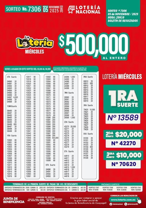 Estos son los resultados del sorteo 7306 de la Lotería Nacional, que jugó la noche del 5 de noviembre de 2025.