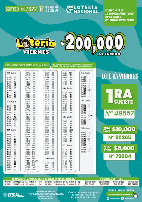 Estos son los resultados del sorteo 7322 de la Lotería Nacional, que jugó la noche del 12 de diciembre de 2025.