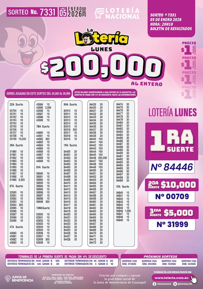 Estos son los resultados del sorteo 7331 de la Lotería Nacional, que jugó la noche del 5 de enero de 2026.
