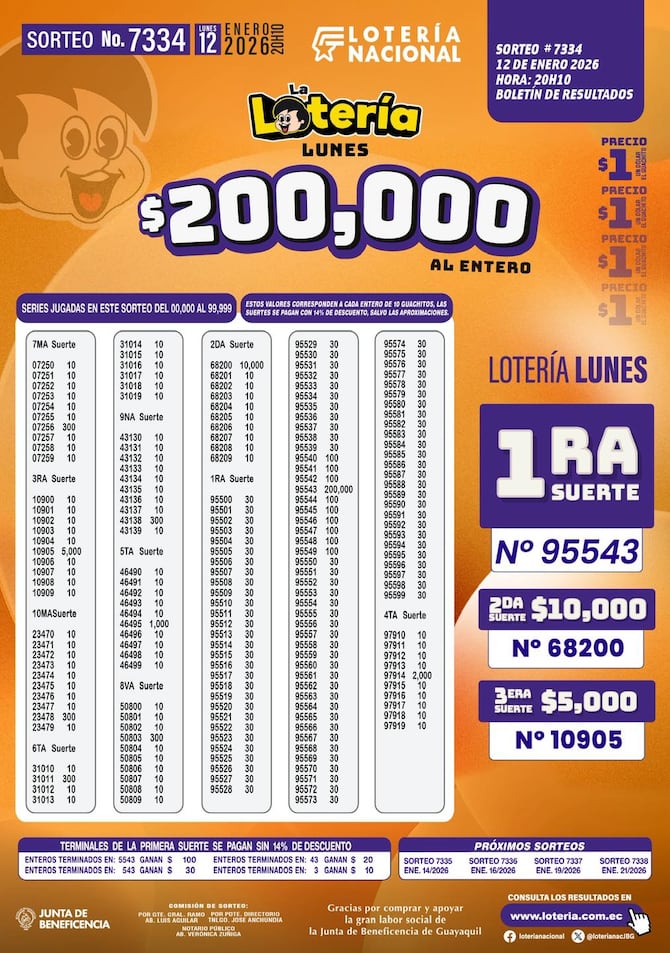 Estos son los resultados del sorteo 7334 de la Lotería Nacional, que jugó la noche del 12 de enero de 2026.