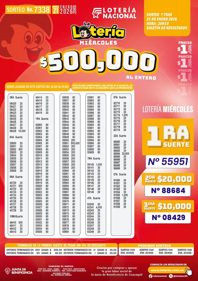 Estos son los resultados del sorteo 7338 de la Lotería Nacional, que jugó la noche del 21 de enero de 2026.