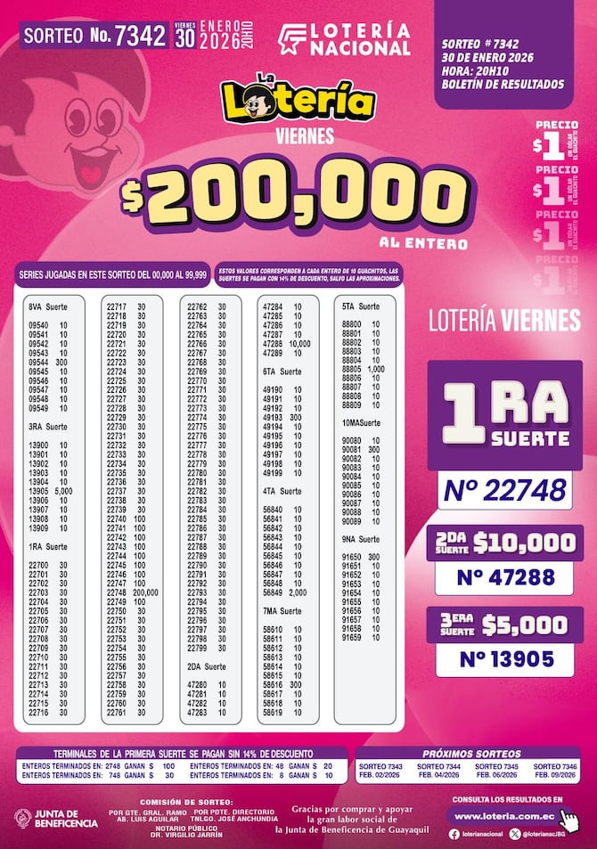Estos son los resultados del sorteo 7342 de la Lotería Nacional, que jugó la noche del 30 de enero de 2026.