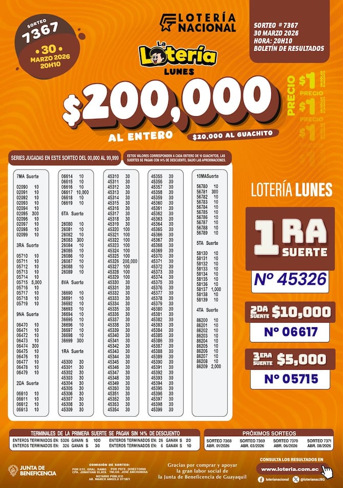 Estos son los resultados del sorteo 7367 de la Lotería Nacional, que jugó la noche del 30 de marzo de 2026.