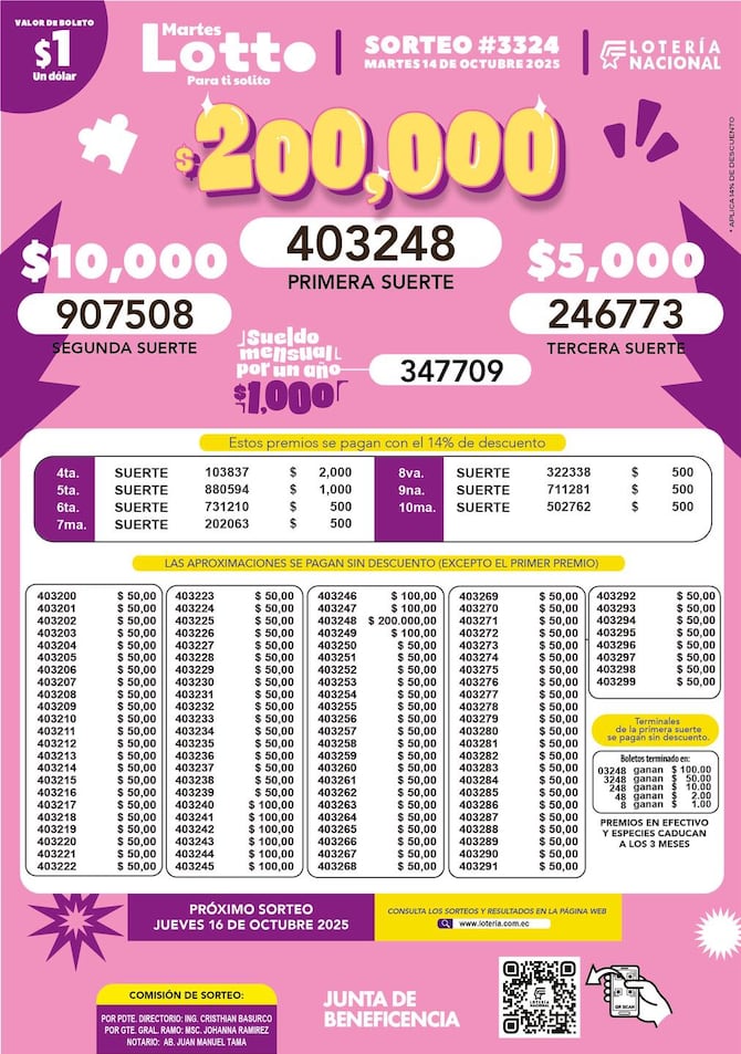 Estos son los resultados del sorteo 3324 del Lotto, de la Lotería Nacional, que se realizó el 14 de octubre de 2025.
