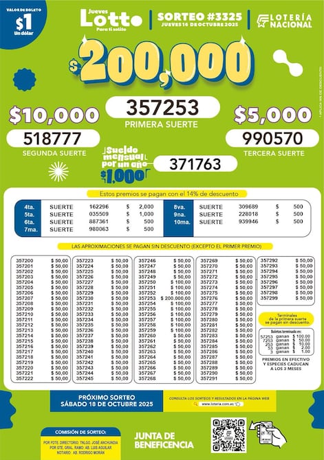 Estos son los resultados del sorteo 3325 del Lotto, de la Lotería Nacional, que se realizó el 16 de octubre de 2025.