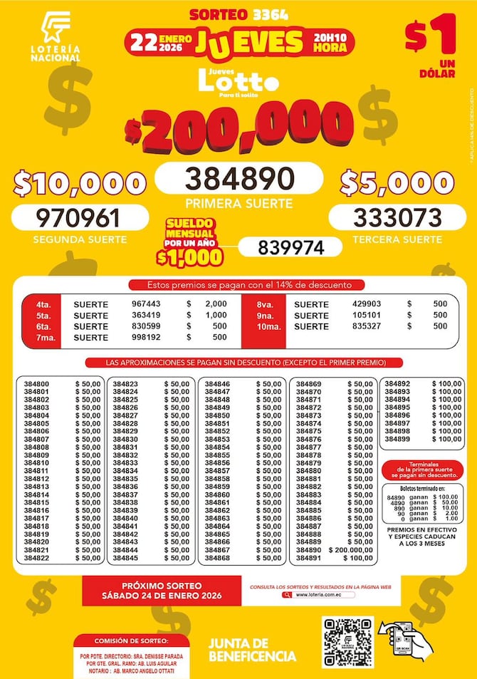 Estos son los resultados del sorteo 3364 del Lotto, de la Lotería Nacional, que se realizó el 22 de enero de 2026.