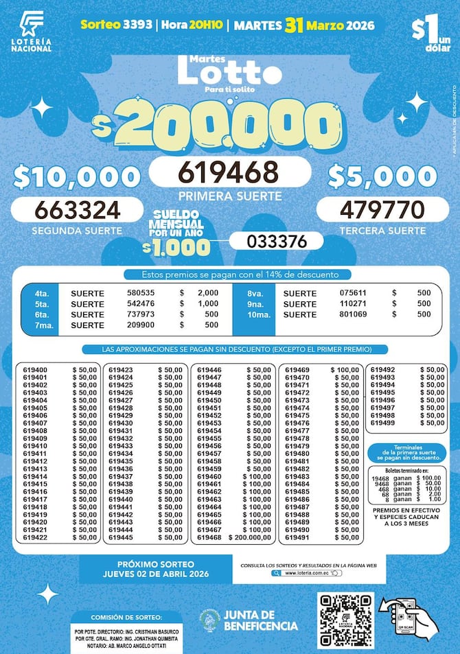 Estos son los resultados del sorteo 3393 del Lotto, de la Lotería Nacional, que se realizó el 31 de marzo de 2026.