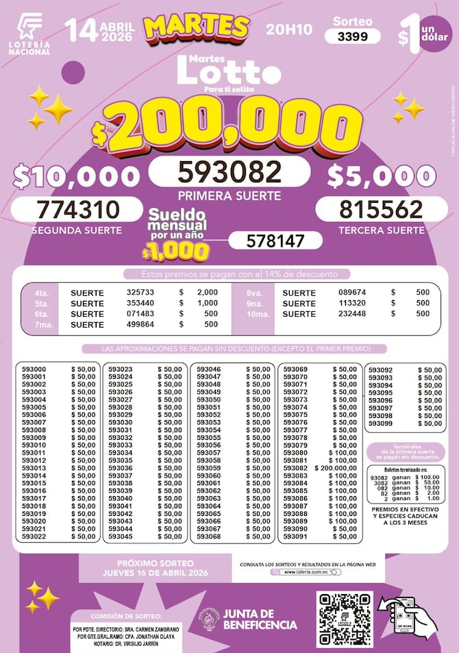 Estos son los resultados del sorteo 3399 del Lotto, de la Lotería Nacional, que se realizó el 14 de abril de 2026.