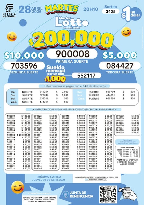 Estos son los resultados del sorteo 3405 del Lotto, de la Lotería Nacional, que se realizó este 28 de abril de 2026.