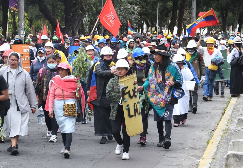 Una marcha que partió desde las zonas de paz localizadas en las universidades Central y Politécnica Salesiana y desde el parque El Arbolito camina por las calles hacia el centro histórico de Quito este lunes, en el día 15 del paro nacional convocado por la Confederación de Nacionalidades Indígenas (Conaie).