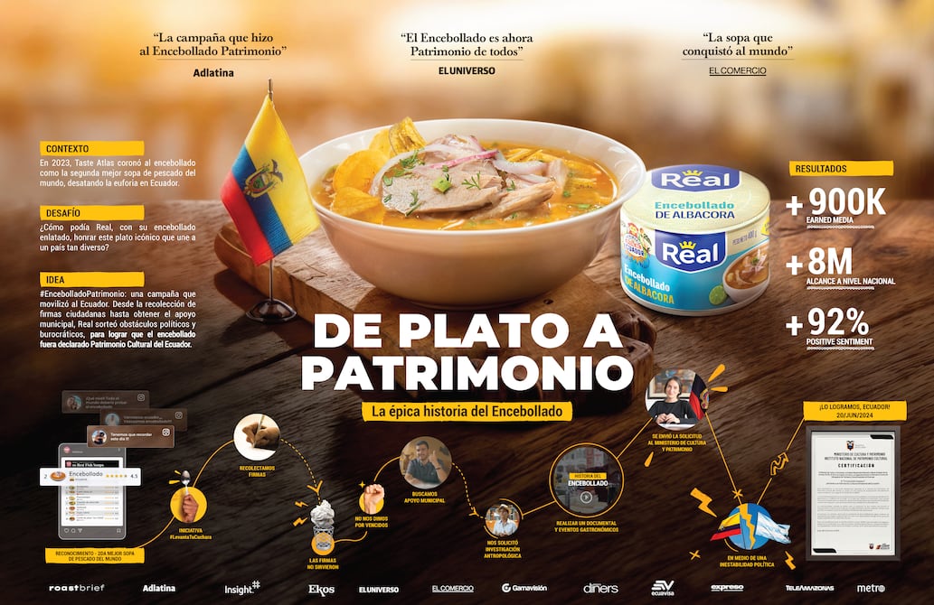 La campaña premiada, desarrollada junto con Alimentos Real, impulsó la declaratoria del encebollado como patrimonio cultural inmaterial del Ecuador, una propuesta que trascendió la publicidad para convertirse en un movimiento de identidad nacional.
