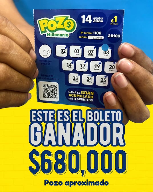 El 14 de octubre, en el sorteo n.º 1106 de Pozo Millonario, se celebró la victoria de un nuevo ganador del acumulado de aproximadamente $ 680.000. El boleto premiado fue vendido en la ciudad de Guayaquil, y los números afortunados fueron 02, 03, 07, 08, 14, 17, 19, 20, 23, 24 y 25. En esta ocasión, la mascota favorecida fue el papagayo, símbolo de buena suerte para muchos jugadores.