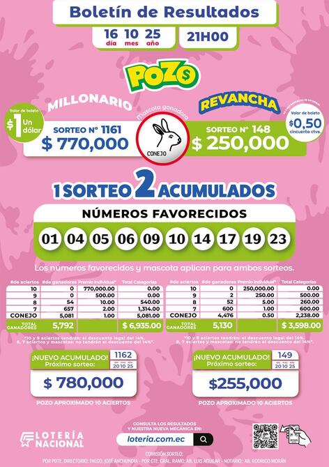 Aquí el boletín del Pozo Millonario sorteo 1161