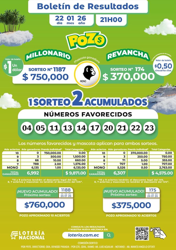 El detalle de la combinación de números ganadores del Pozo Revancha sorteo 174, realizado este jueves, 22 de enero de 2026, es el siguiente: