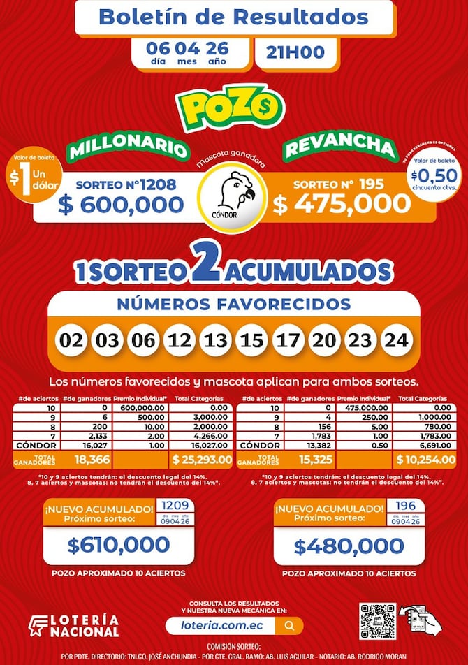 El premio del Pozo Millonario sorteo 1208 se jugó este lunes, 6 de abril de 2026, y estos son los números ganadores: