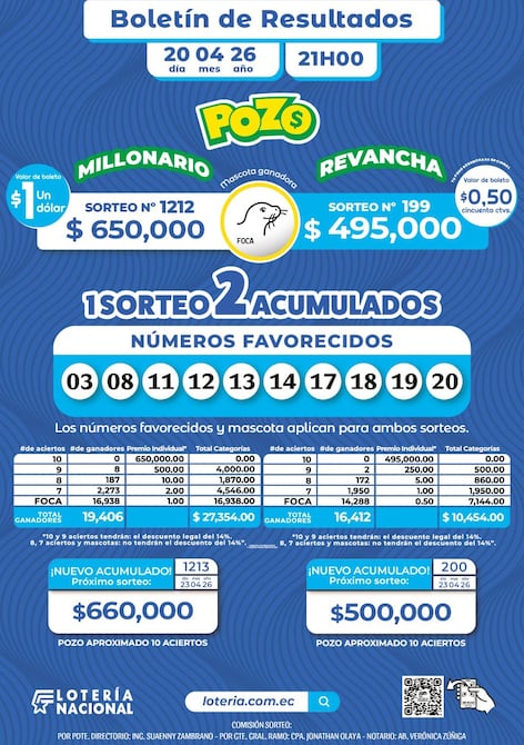 El premio del Pozo Millonario sorteo 1212 se jugó este lunes, 20 de abril de 2026, y estos son los números ganadores: