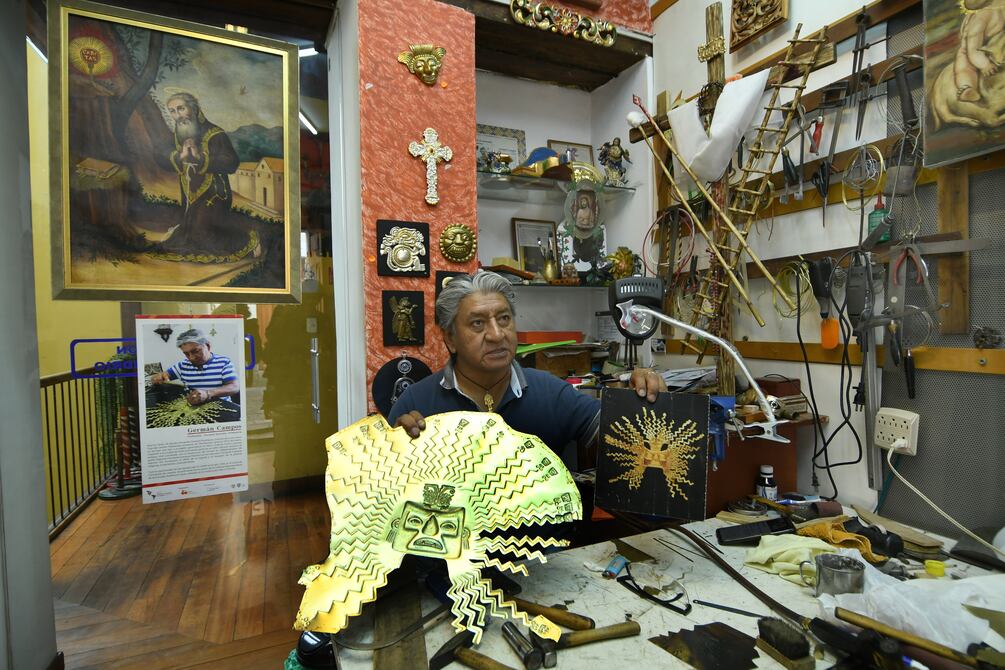 La réplica de una imagen, el sol, en material de bronce, de la cultura Tolita, era en lo que trabajaba Germán Campos, un orfebre que nació en Quito pero que desciende de familiares de la Sierra Centro de Ecuador.