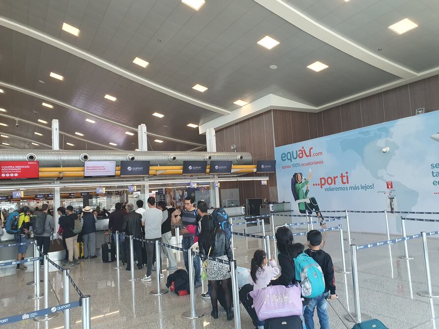 La oficina de la línea aérea Equair en el aeropuerto internacional Mariscal Sucre, en Tababela, a unos 30 minutos de Quito, está abierta, pero no hubo presencia de personas en las principales horas de este lunes.