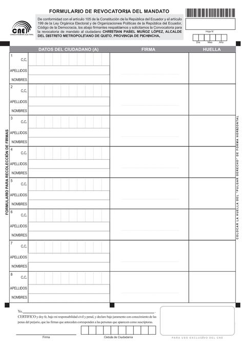 Datos del ciudadano, como cédula de identidad, apellidos y nombres, firma o huella, son los espacios que deben ser llenados por aquellas personas que están a favor de la revocatoria del mandato del alcalde de Quito, Pabel Muñoz.