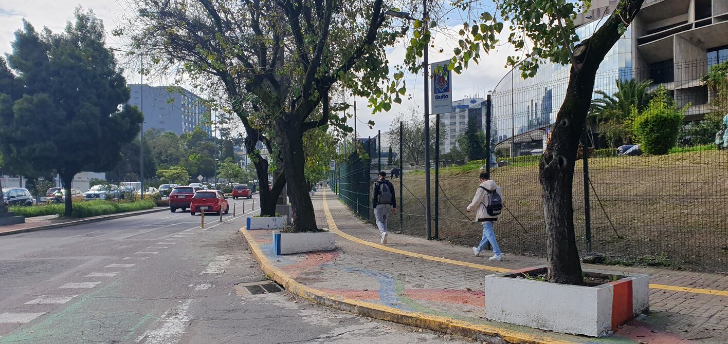 Una línea amarilla de pavimento con relieve o podotáctil cruza las avenidas Patria y 6 de Diciembre, en el norte de Quito, por donde caminan dos personas.