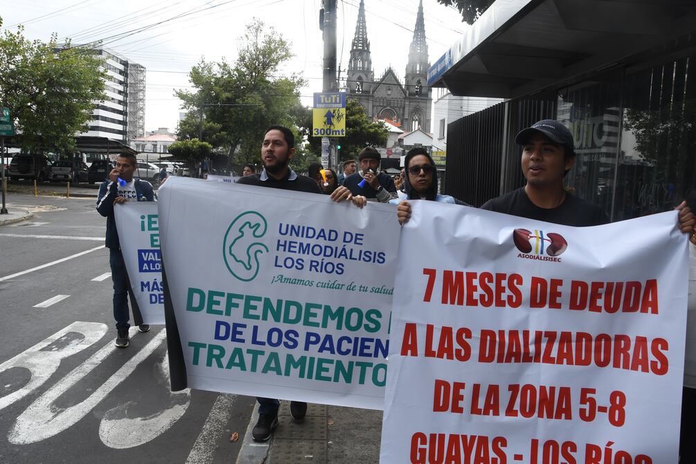 “Queremos que nos paguen”. Ese fue el grito de unas 20 personas de clínicas dializadoras de cinco provincias, en un plantón que realizaron –la mañana de este lunes– en los exteriores del Instituto Ecuatoriano de Seguridad Social (IESS) de la avenida 9 de Octubre, en el centro norte de Quito.