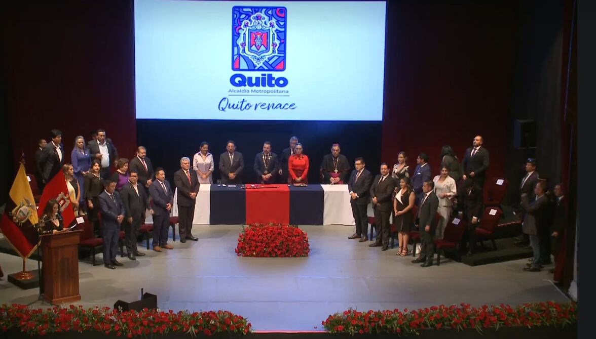 Imágenes de cúpulas, de montañas, de geranios, del sol, de la Virgen de Legarda que está en el Panecillo, de un oso de anteojos, que luego se transforman en figuras dibujadas, con diferentes tonos de colores celeste, azul, y rojo, y en el centro el escudo de Quito, es como luce la nueva imagen de la Alcaldía de Quito.