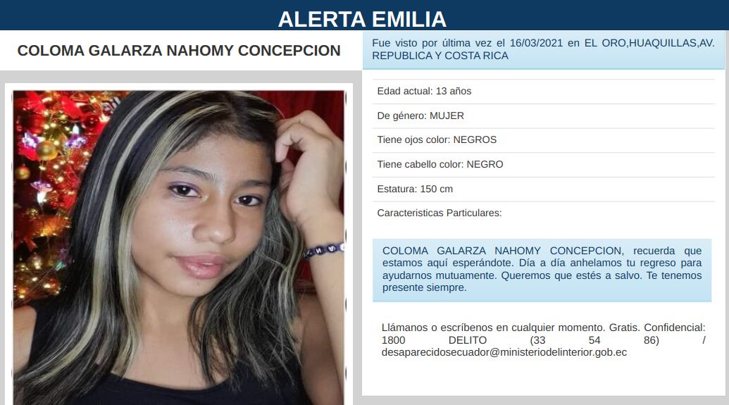 La adolescente Nahomy Coloma Galarza (13 años) es buscada por autoridades policiales tras el reporte de su desaparición el último 16 de marzo.
