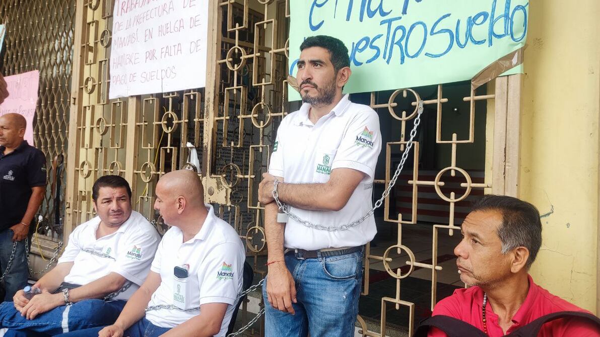 Trabajadores del Gobierno Provincial de Manabí se tomaron este jueves 14 de diciembre las instalaciones de la institución en protesta por el atraso en el pago de sus sueldos.