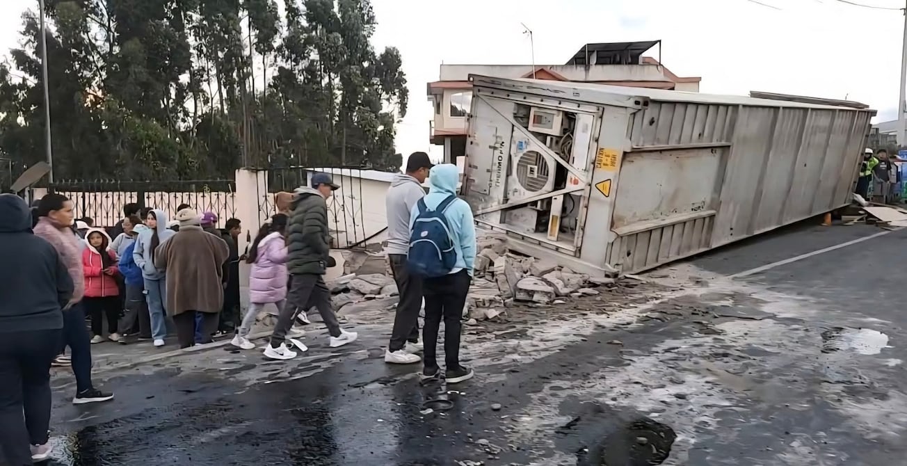 Un tráiler que circulaba desde la parroquia Montalvo hacia Huachi Grande, sector La Manzana de Oro, en el sur de Ambato, se volcó la tarde del lunes.