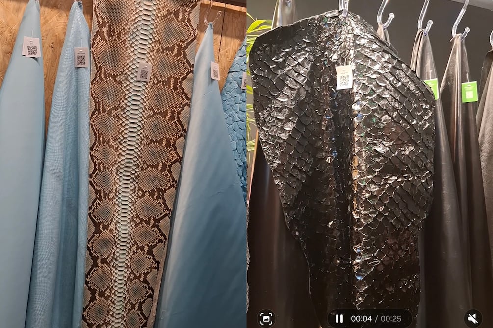 Las pieles son de peces como el pirarucú y tilapia, esta última es una piel menor para hacer patchwork (técnica de costura artesanal que une pequeños trozos de tela): "El material puede trabajarse más en su espesor para dejarlo más suave”.