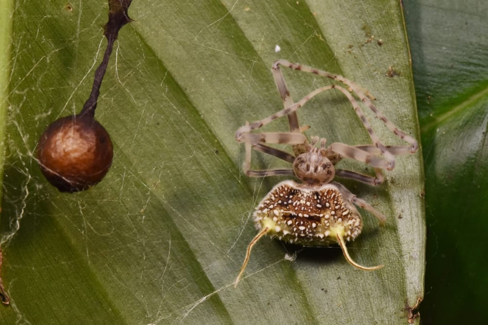 Debido a esta característica, los investigadores confundieron al ejemplar con una araña infectada por un hongo. La araña, describe el Inabio, permanecía inmóvil, colgando boca abajo bajo una hoja, con protuberancias en el abdomen que simulan las estructuras reproductivas del hongo.
