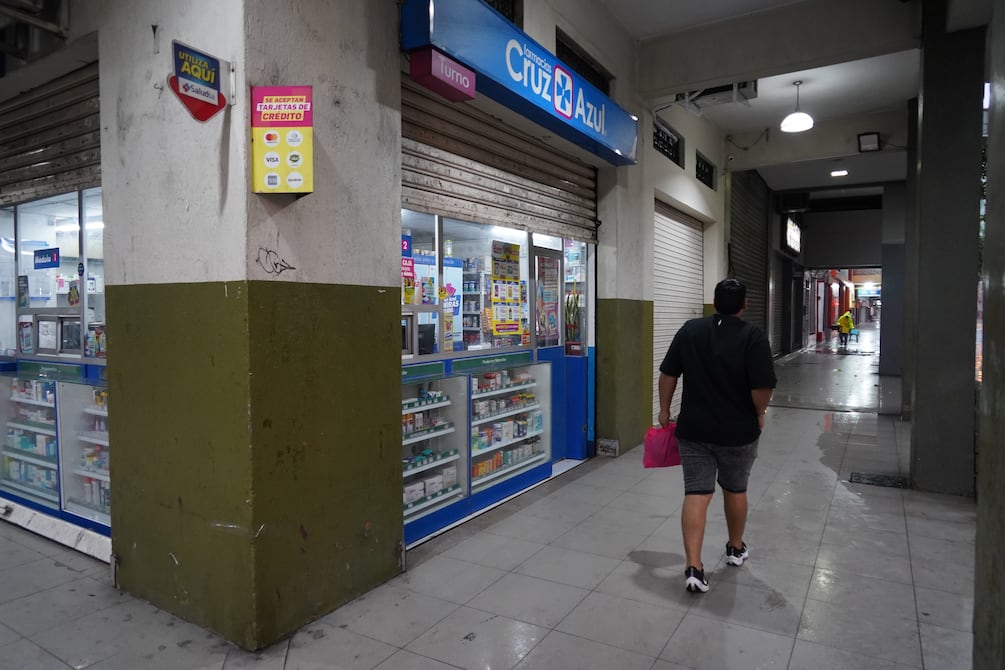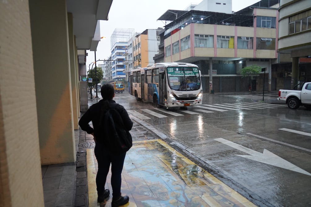 La lluvia apenas empezaba a bajar de intensidad y a las 06:54, una farmacia en Rumichaca y Vélez abría su puerta corrediza mientras un pequeño grupo de cuatro hombres y una mujer esperaba el bus.