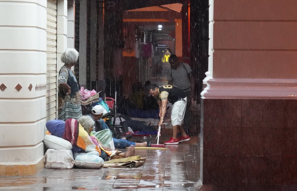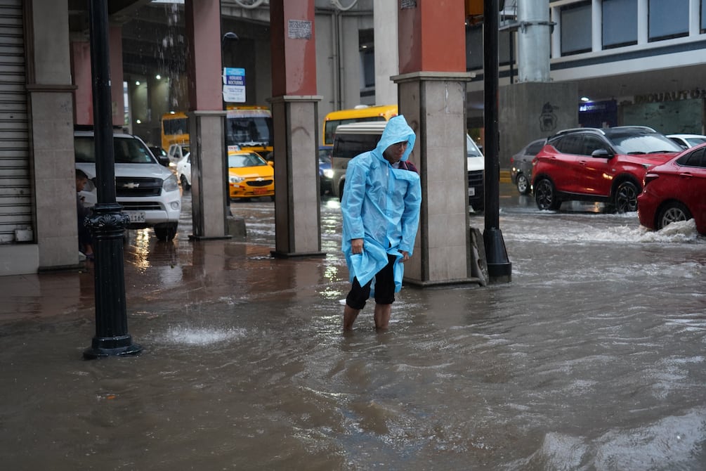 Cerca de este sitio, otras personas caminaban cubiertas con cartones o fundas negras, avanzando con extrema precaución sobre las baldosas que la lluvia había vuelto resbaladizas.