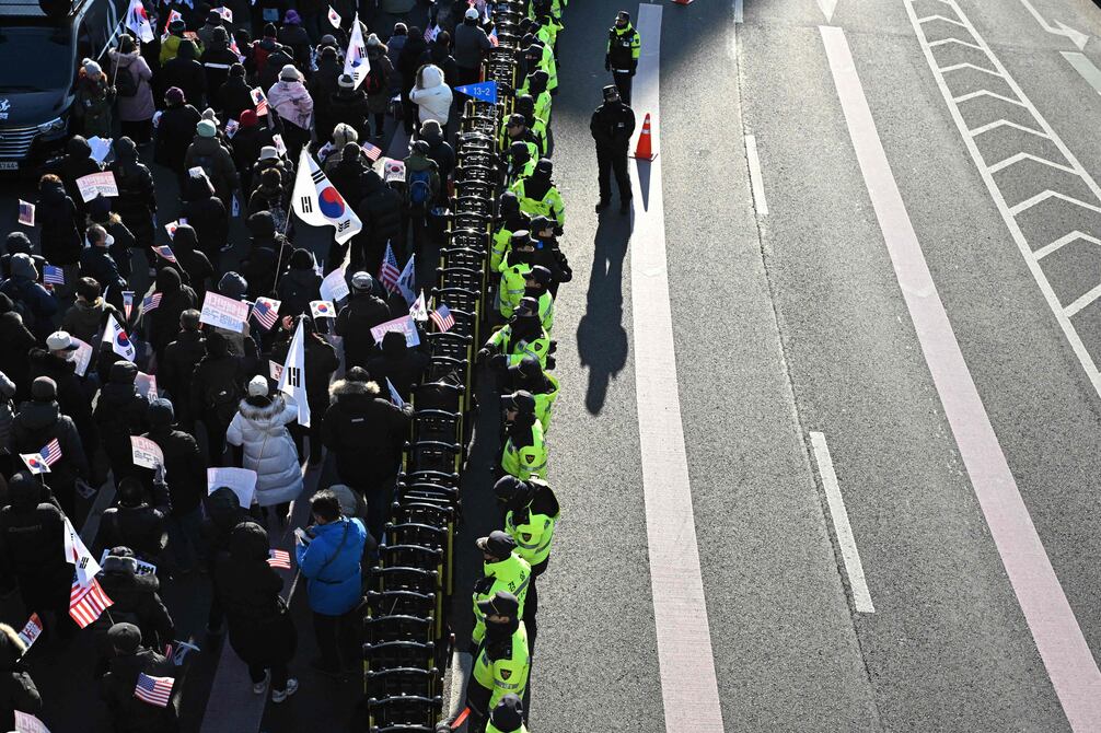 La Policía surcoreana ha desplegado este viernes unos 2.700 efectivos en el exterior de la residencia del presidente, Yoon Suk-yeol, en Seúl donde se concentran más de 1.000 seguidores del mandatario para protestar por el intento de las autoridades de arrestarlo de manera temporal.