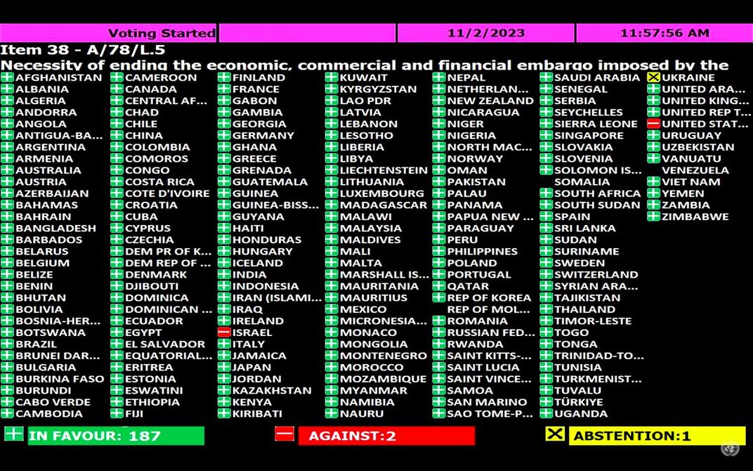 Cuba volvió a lograr este jueves, por trigésimoprimera ocasión, una victoria moral en la ONU, donde 187 países votaron a favor del fin del embargo impuesto por Estados Unidos contra la isla, vigente desde hace seis décadas.