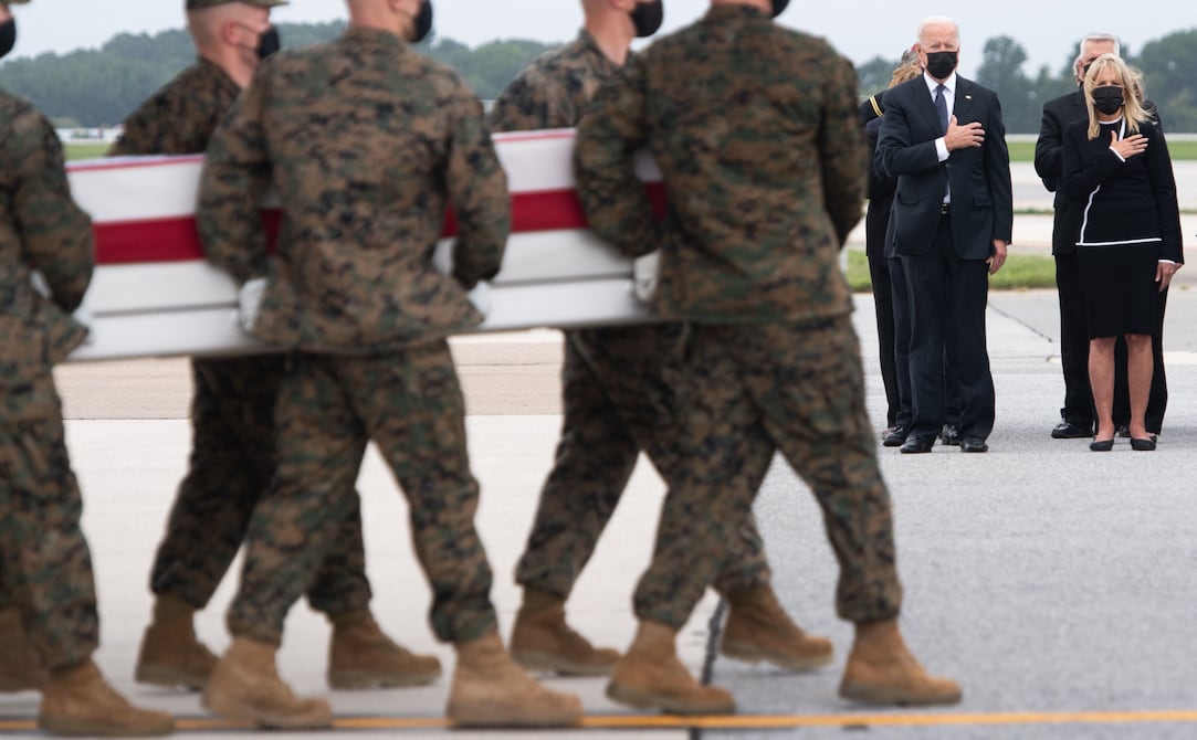 El presidente de Estados Unidos, Joe Biden, acompañado por su esposa, Jill Biden, honró los féretros con los restos de once de los trece militares muertos en un atentando el jueves en Kabul, a su llegada este domingo a la base de Dover (Delaware, en EE.UU.).