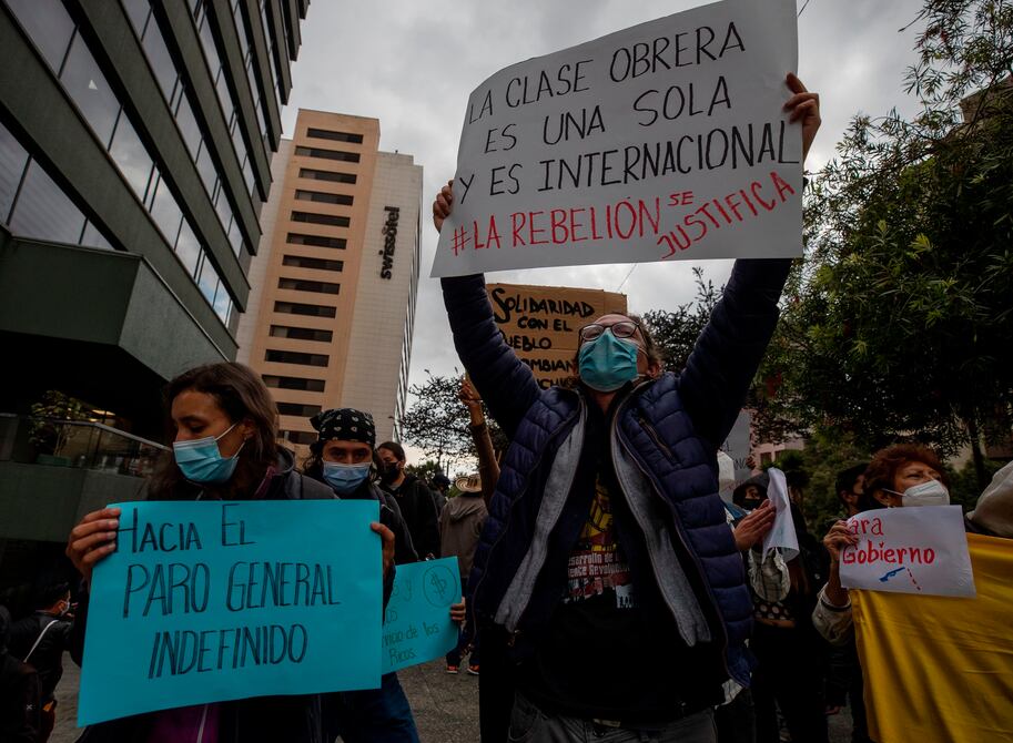 Varias decenas de migrantes colombianos, apoyados por activistas ecuatorianos, realizaron este martes un plantón de protesta en las afueras de la Embajada de Colombia en Quito, al grito incesante de “Resistencia” y en apoyo a las manifestaciones sociales que tienen lugar en el país vecino.