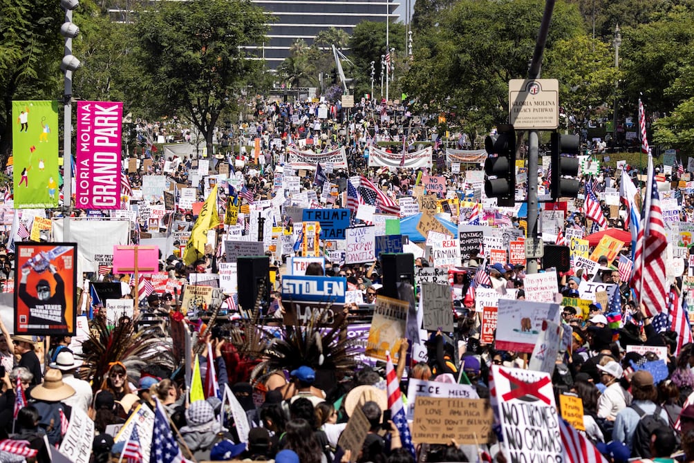 Decenas de miles de personas se manifestaron en Estados Unidos contra Donald Trump antes de que el mandatario republicano presida este sábado, día de su cumpleaños, un desfile militar que se ha visto enlutado por la muerte a tiros de una congresista estatal demócrata.