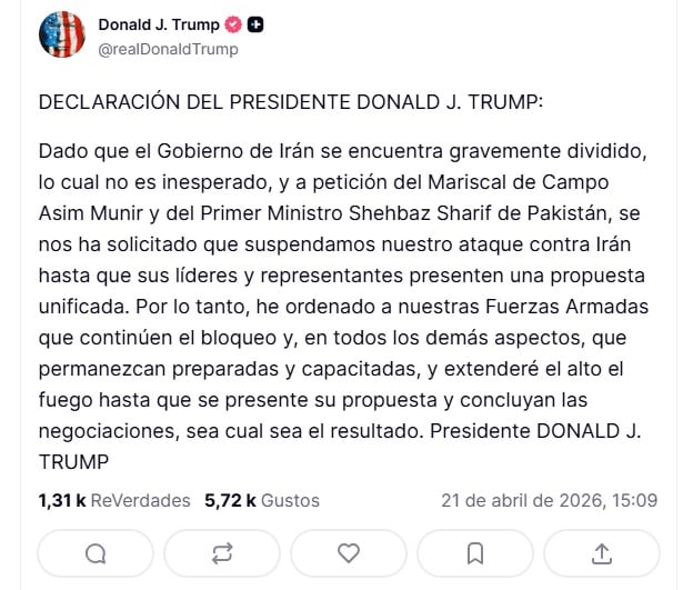 El presidente de Estados Unidos, Donald Trump, anunció este martes que, a petición de Pakistán, ha decidido extender el alto el fuego que debía vencer el miércoles hasta que Irán presente una propuesta de acuerdo.