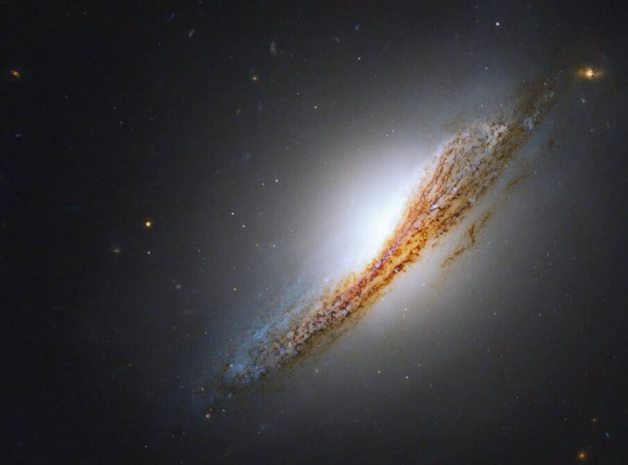 Las capacidades visibles e infrarrojas del telescopio espacial Hubble capturaron esta vista de canto de la galaxia lenticular NGC 612, una llamativa raya naranja y azul.