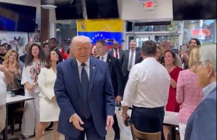 Trump ingresó al establecimiento, saludó a los clientes y preguntó: ¿Quién es de Venezuela?, venimos a conseguir comida para el AF1″, de acuerdo con la prensa local.