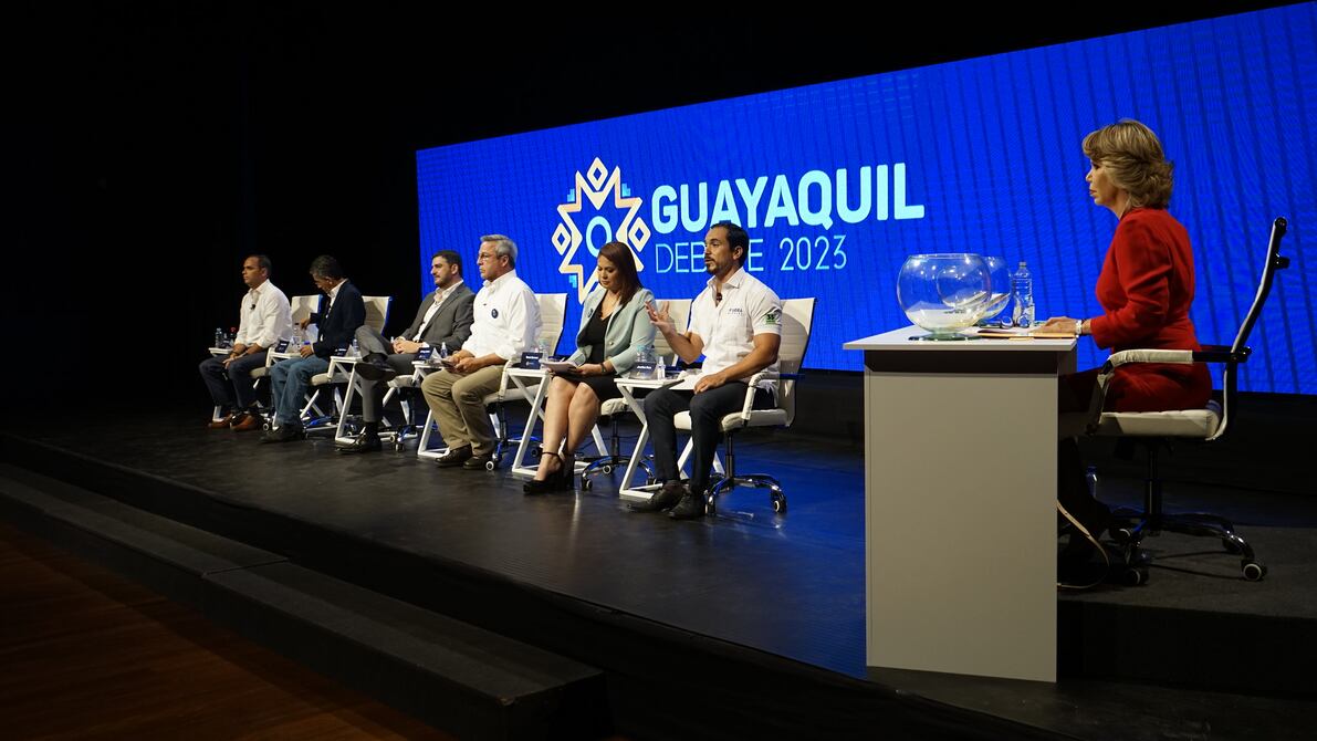 Jimmy Jairala, Centro Democrático-Partido Socialista, listas 1-17; Pedro Pablo Duart, SUMA, lista 23; Jonathan Parra, Mover, lista 35; Rocío Serrano, Sociedad Patriótica, lista 3; Aquiles Álvarez, Revolución Ciudadana, lista 5; y Antonio Orbe, Avanza, lista 8, fueron los 6 de los 11 candidatos a la Alcaldía de Guayaquil en exponer sus ofertas en el debate que se realizó en el Teatro Centro de Arte de Guayaquil.