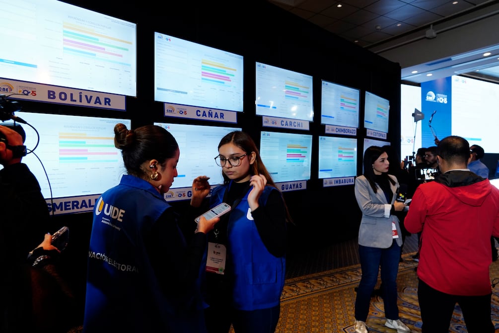 Minutos antes de las 19:00 de este 16 de noviembre, en uno de los salones del Hotel Colón en Quito, de los rostros de activistas sociales y políticos críticos del gobierno de Daniel Noboa, sobresalían sonrisas de entusiasmo al observar los primeros resultados que aparecían en 27 pantallas de televisión, de las elecciones de referéndum y consulta popular.