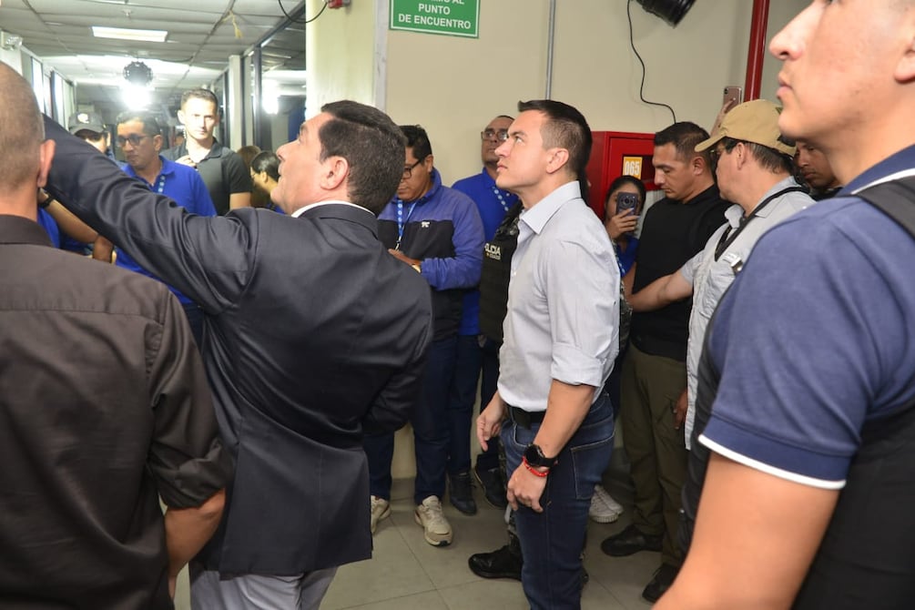 El mandatario llegó al medio de comunicación a las 9:22 en compañía de su comitiva. Lo acompañan el ministro de Obras Públicas, Roberto Luque, así como el exsecretario de Comunicación Roberto Izurieta y demás miembros de su gabinete.