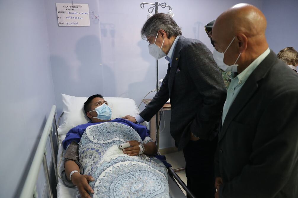 Los cabos primero de Infantería Gilberto Corrales y Nelson Guascota, agredidos y heridos durante las manifestaciones del 26 de octubre de 2021, recibieron la visita del presidente Guillermo Lasso y los ministros de Defensa, Luis Hernández, y Gobierno Alexandra Vela, en el Hospital de las Fuerzas Armadas n.º 1 (FF. AA.), la mañana de este jueves 28 de octubre.