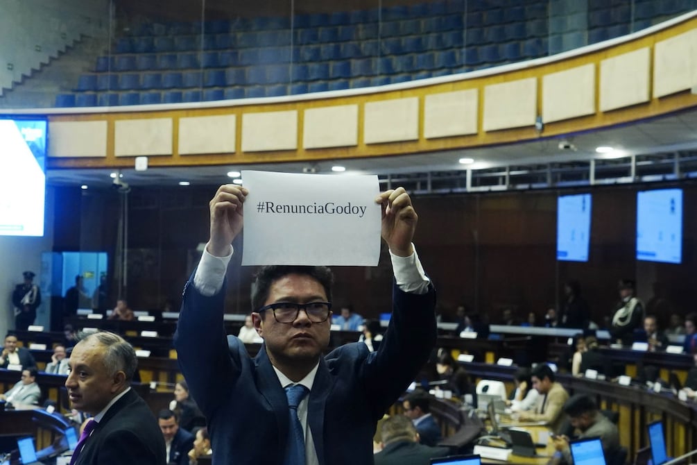 La tarde de este jueves, 15 de enero de 2026, el titular de la Judicatura, quien enfrenta una solicitud de juicio político en el Parlamento, expuso un resumen de su gestión al frente de este organismo. Lo hizo mientras asambleístas de la bancada de la Revolución Ciudadana (RC) exponían carteles con escritos como: “Justicia secuestrada” o “Renuncia Godoy”, en alusión al pedido de gremios como el Colegio de Abogados de Pichincha, que exigen la salida del funcionario.